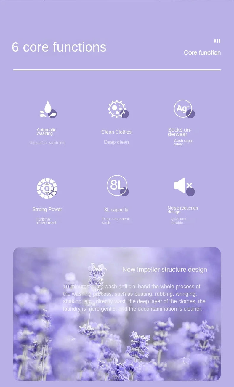 The 8L Mini Folding Washing Machine is a compact, portable, and efficient laundry solution, ideal for small loads such as baby clothes, underwear, socks, and towels. Designed with automatic washing modes, a drain basket for spin-drying, and blue light technology, this mini washer provides a powerful and hygienic cleaning experience. Perfect for apartments, dorms, travel, and camping.